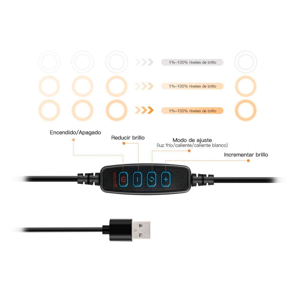 – Tres modos de luz: luz cálida (2800 K), luz diurna (4500 K), luz blanca (6000 K)